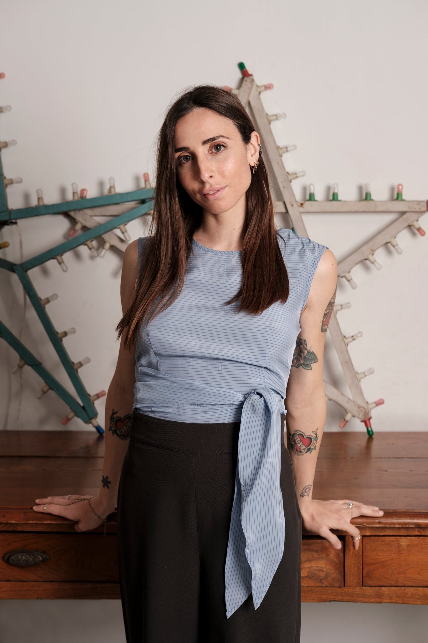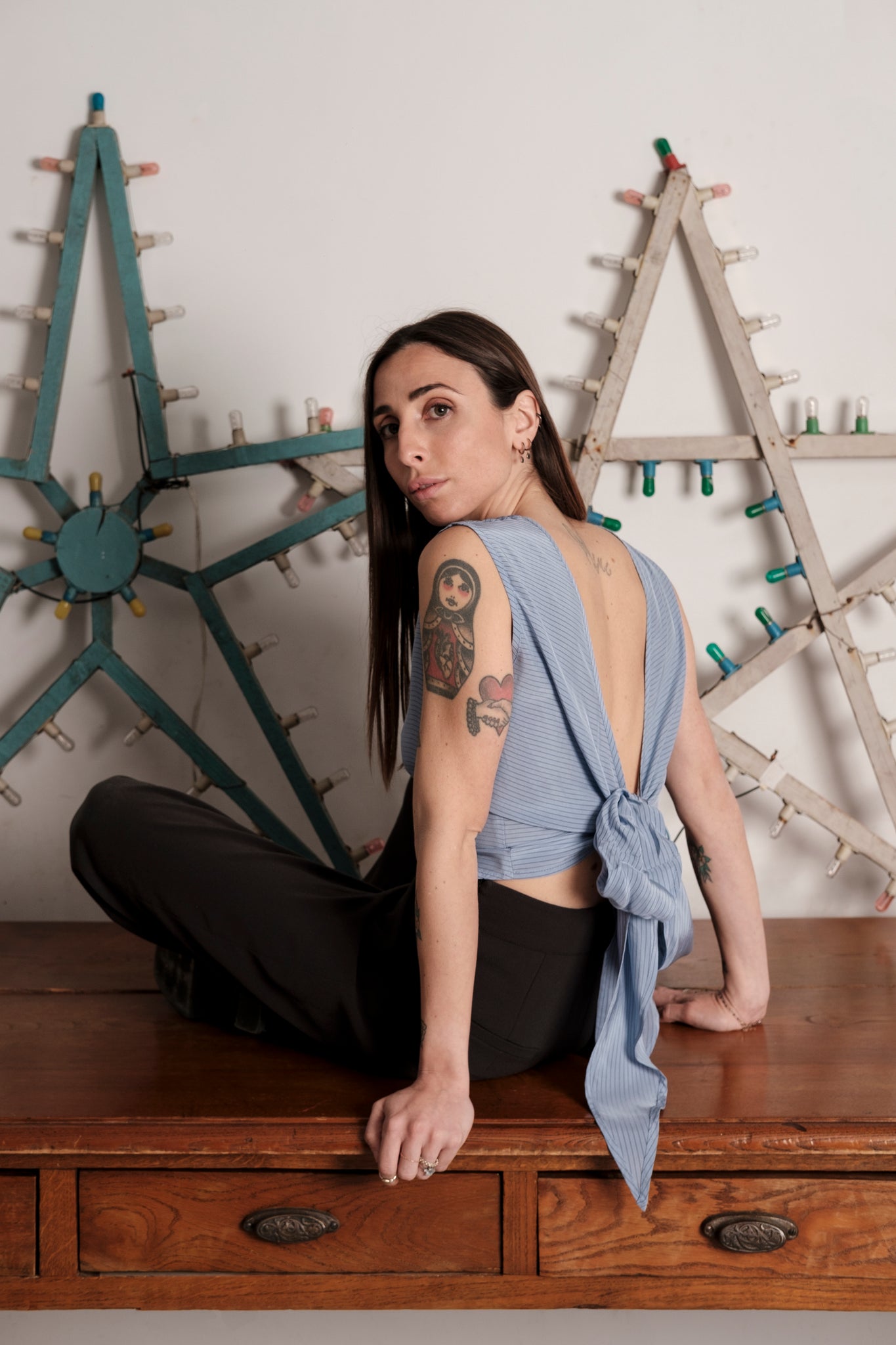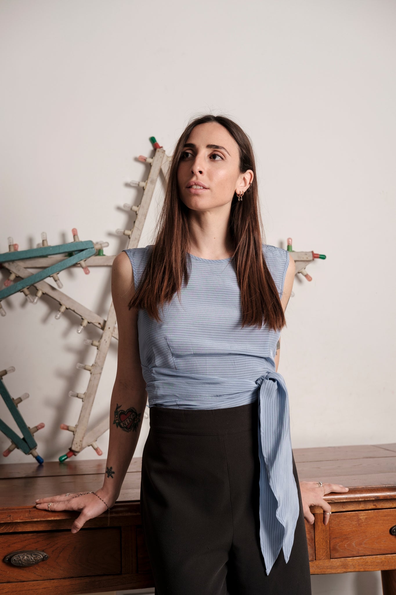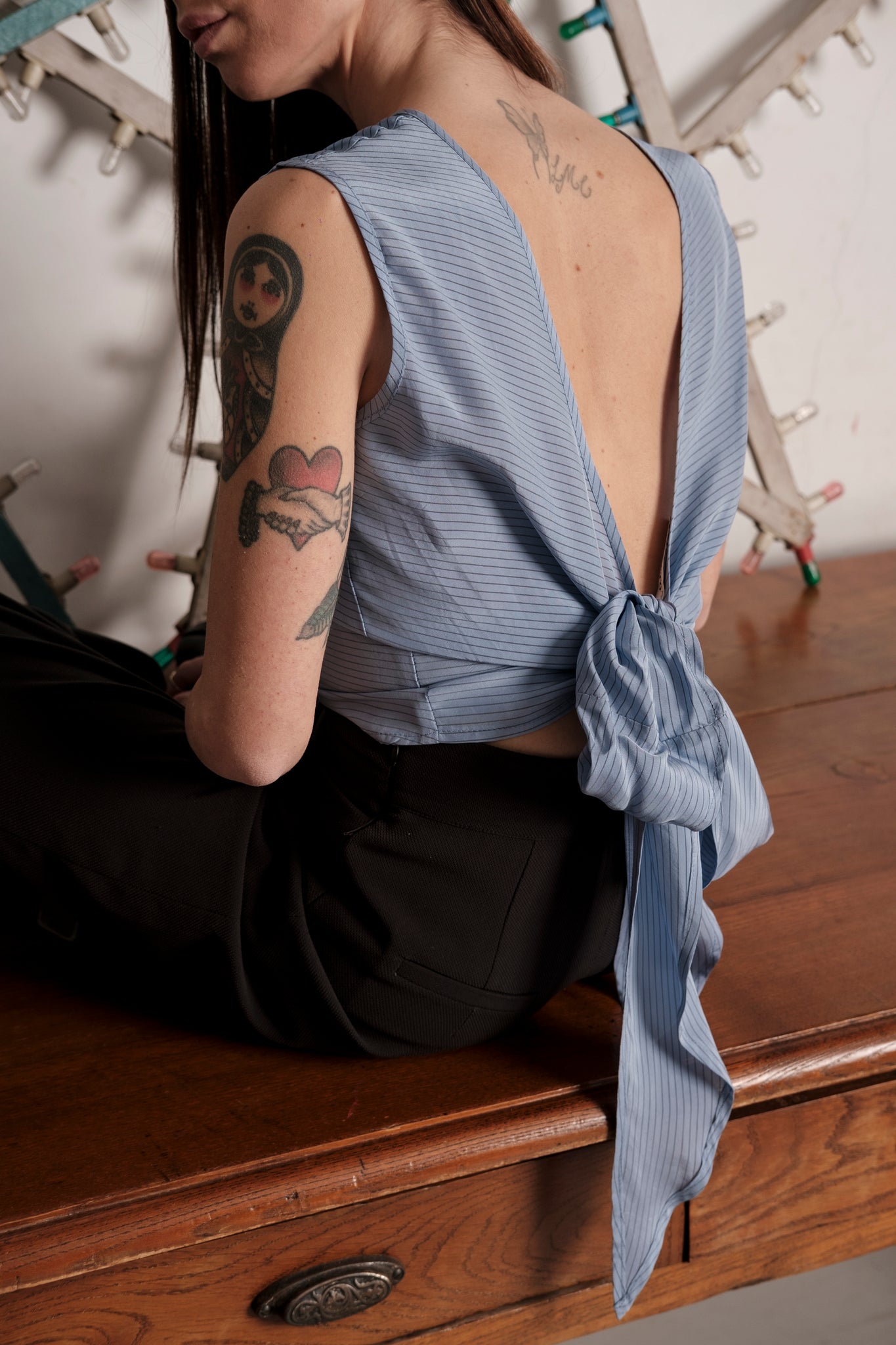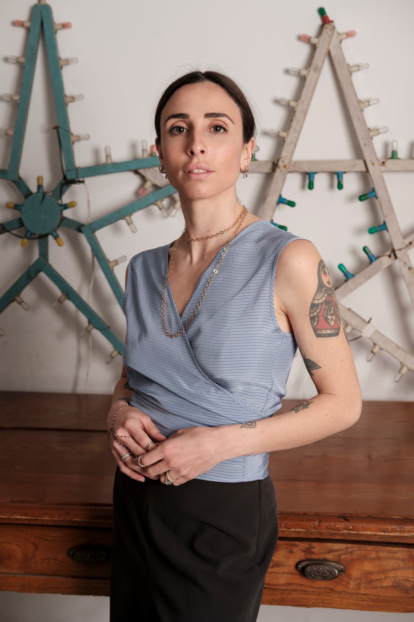 Top ad incrocio in pura seta azzurro effetto "gessato"