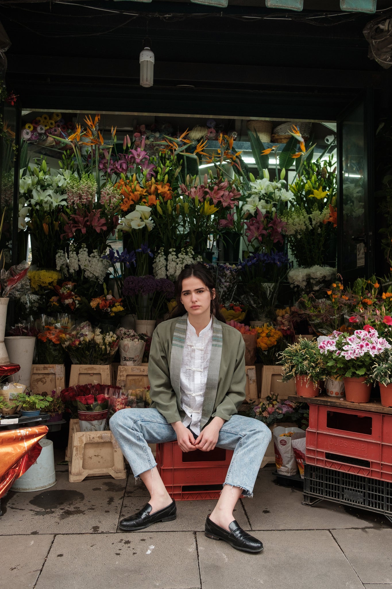 Camicia in pizzo San Gallo con collo alla coreana, chiusura frontale con alamari e maniche a tre quarti